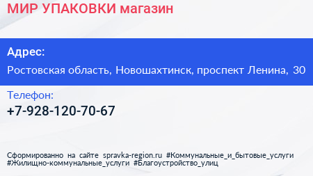 МИР УПАКОВКИ, магазин по адресу Ростовская область, Новошахтинск, проспект Ленина, 30 в дальнейшем Организация, размещена в следующих категориях: