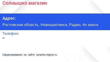 Солнышко, магазин по адресу Ростовская область, Новошахтинск, Радио, 4н киоск в дальнейшем Организация, размещена в следующих категориях: