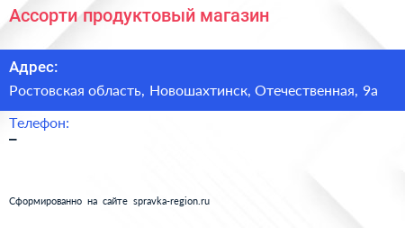 Ассорти, продуктовый магазин по адресу Ростовская область, Новошахтинск, Отечественная, 9а в дальнейшем Организация, размещена в следующих категориях: