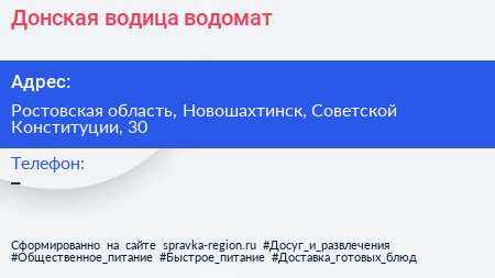 Донская водица, водомат по адресу Ростовская область, Новошахтинск, Советской Конституции, 30 в дальнейшем Организация, размещена в следующих категориях:
