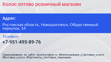 Колос, оптово-розничный магазин по адресу Ростовская область, Новошахтинск, Общественный переулок, 14 в дальнейшем Организация, размещена в следующих категориях: