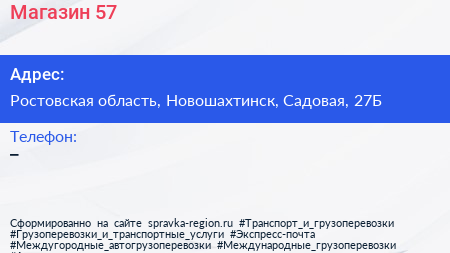 Магазин №57 по адресу Ростовская область, Новошахтинск, Садовая, 27Б в дальнейшем Организация, размещена в следующих категориях: