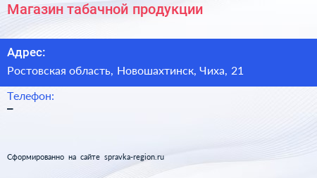 Магазин табачной продукции по адресу Ростовская область, Новошахтинск, Чиха, 21 в дальнейшем Организация, размещена в следующих категориях: