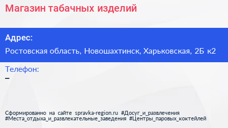Магазин табачных изделий по адресу Ростовская область, Новошахтинск, Харьковская, 2Б к2 в дальнейшем Организация, размещена в следующих категориях: