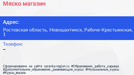 Мяско, магазин по адресу Ростовская область, Новошахтинск, Рабоче-Крестьянская, 1 в дальнейшем Организация, размещена в следующих категориях: