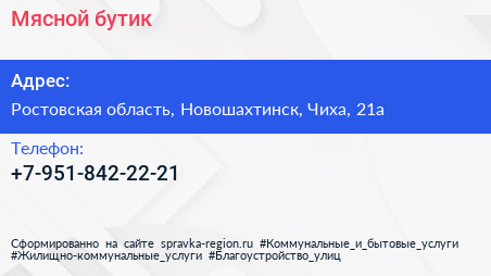 Мясной бутик по адресу Ростовская область, Новошахтинск, Чиха, 21а в дальнейшем Организация, размещена в следующих категориях:
