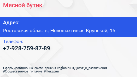 Мясной бутик по адресу Ростовская область, Новошахтинск, Крупской, 16 в дальнейшем Организация, размещена в следующих категориях: