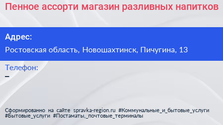 Пенное ассорти, магазин разливных напитков по адресу Ростовская область, Новошахтинск, Пичугина, 13 в дальнейшем Организация, размещена в следующих категориях:
