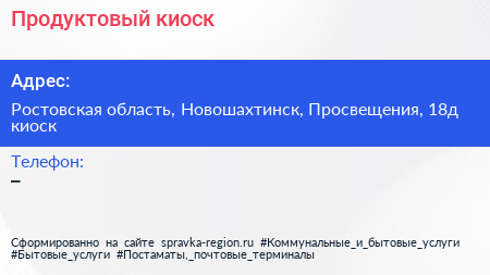 Продуктовый киоск по адресу Ростовская область, Новошахтинск, Просвещения, 18д киоск в дальнейшем Организация, размещена в следующих категориях: