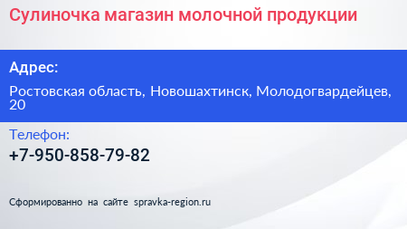 Сулиночка, магазин молочной продукции по адресу Ростовская область, Новошахтинск, Молодогвардейцев, 20 в дальнейшем Организация, размещена в следующих категориях: