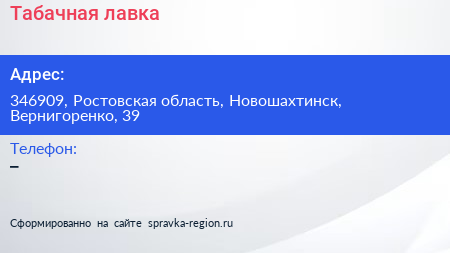 Табачная лавка по адресу 346909, Ростовская область, Новошахтинск, Вернигоренко, 39 в дальнейшем Организация, размещена в следующих категориях:
