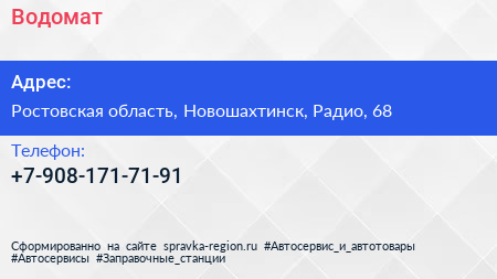 Водомат по адресу Ростовская область, Новошахтинск, Радио, 68 в дальнейшем Организация, размещена в следующих категориях: