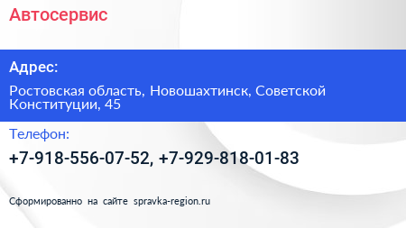 Автосервис по адресу Ростовская область, Новошахтинск, Советской Конституции, 45 в дальнейшем Организация, размещена в следующих категориях: