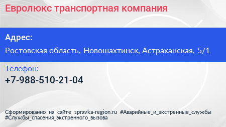 Евролюкс, транспортная компания по адресу Ростовская область, Новошахтинск, Астраханская, 5/1 в дальнейшем Организация, размещена в следующих категориях: