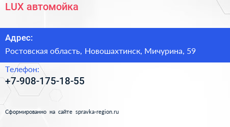 LUX, автомойка по адресу Ростовская область, Новошахтинск, Мичурина, 59 в дальнейшем Организация, размещена в следующих категориях: