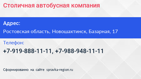 Столичная, автобусная компания по адресу Ростовская область, Новошахтинск, Базарная, 17 в дальнейшем Организация, размещена в следующих категориях: