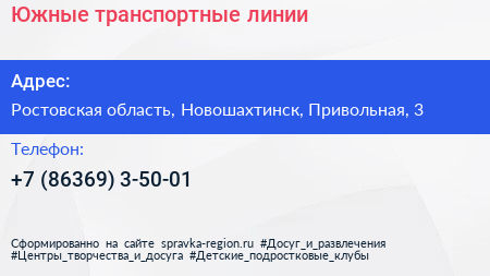 Южные транспортные линии по адресу Ростовская область, Новошахтинск, Привольная, 3 в дальнейшем Организация, размещена в следующих категориях: