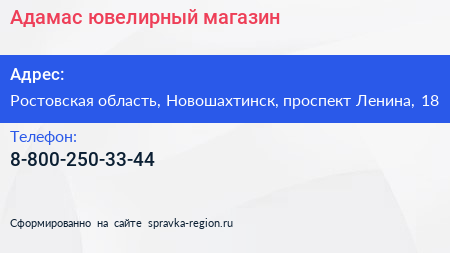 Адамас, ювелирный магазин по адресу Ростовская область, Новошахтинск, проспект Ленина, 18 в дальнейшем Организация, размещена в следующих категориях: