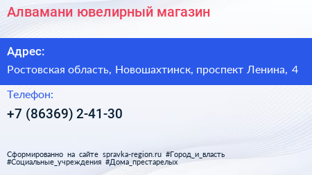 Алвамани, ювелирный магазин по адресу Ростовская область, Новошахтинск, проспект Ленина, 4 в дальнейшем Организация, размещена в следующих категориях: