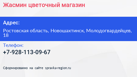 Жасмин, цветочный магазин по адресу Ростовская область, Новошахтинск, Молодогвардейцев, 18 в дальнейшем Организация, размещена в следующих категориях: