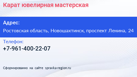 Карат, ювелирная мастерская по адресу Ростовская область, Новошахтинск, проспект Ленина, 24 в дальнейшем Организация, размещена в следующих категориях:
