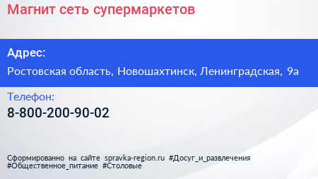Магнит, сеть супермаркетов по адресу Ростовская область, Новошахтинск, Ленинградская, 9а в дальнейшем Организация, размещена в следующих категориях: