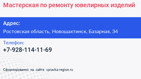 Мастерская по ремонту ювелирных изделий по адресу Ростовская область, Новошахтинск, Базарная, 34 в дальнейшем Организация, размещена в следующих категориях: