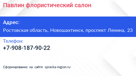 Павлин, флористический салон по адресу Ростовская область, Новошахтинск, проспект Ленина, 23 в дальнейшем Организация, размещена в следующих категориях:
