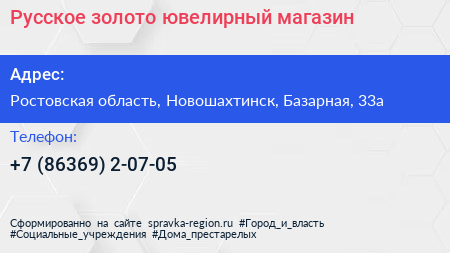 Русское золото, ювелирный магазин по адресу Ростовская область, Новошахтинск, Базарная, 33а в дальнейшем Организация, размещена в следующих категориях: