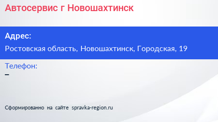 Автосервис, г. Новошахтинск по адресу Ростовская область, Новошахтинск, Городская, 19 в дальнейшем Организация, размещена в следующих категориях: