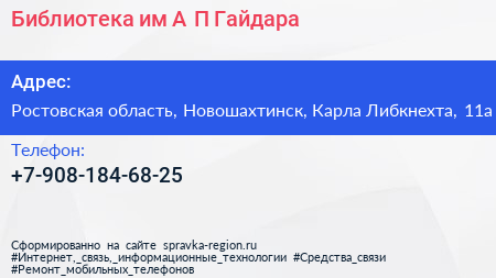 Библиотека им. А.П. Гайдара по адресу Ростовская область, Новошахтинск, Карла Либкнехта, 11а в дальнейшем Организация, размещена в следующих категориях: