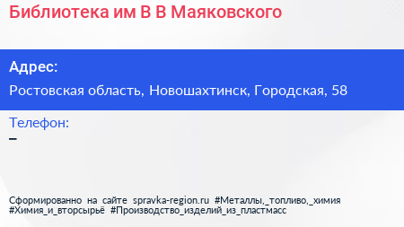Библиотека им. В.В. Маяковского по адресу Ростовская область, Новошахтинск, Городская, 58 в дальнейшем Организация, размещена в следующих категориях: