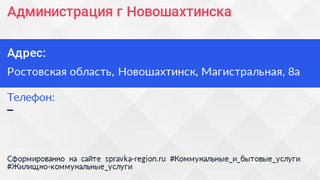 Администрация г. Новошахтинска по адресу Ростовская область, Новошахтинск, Магистральная, 8а в дальнейшем Организация, размещена в следующих категориях: