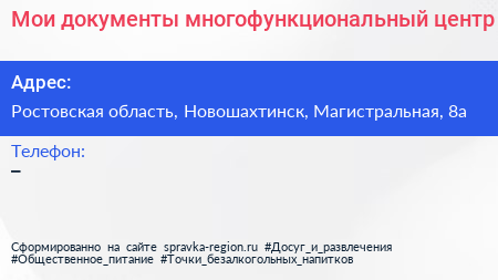 Мои документы, многофункциональный центр по адресу Ростовская область, Новошахтинск, Магистральная, 8а в дальнейшем Организация, размещена в следующих категориях:
