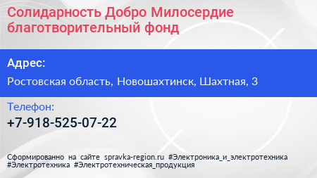 Солидарность. Добро. Милосердие, благотворительный фонд по адресу Ростовская область, Новошахтинск, Шахтная, 3 в дальнейшем Организация, размещена в следующих категориях:
