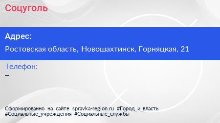Соцуголь по адресу Ростовская область, Новошахтинск, Горняцкая, 21 в дальнейшем Организация, размещена в следующих категориях: