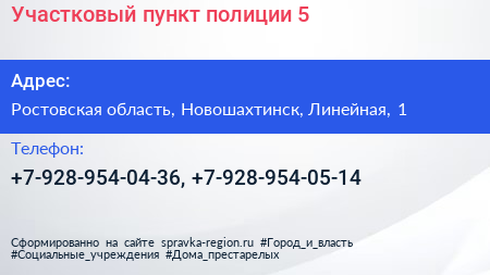 Участковый пункт полиции №5 по адресу Ростовская область, Новошахтинск, Линейная, 1 в дальнейшем Организация, размещена в следующих категориях: