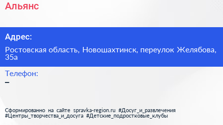 Альянс по адресу Ростовская область, Новошахтинск, переулок Желябова, 35а в дальнейшем Организация, размещена в следующих категориях: