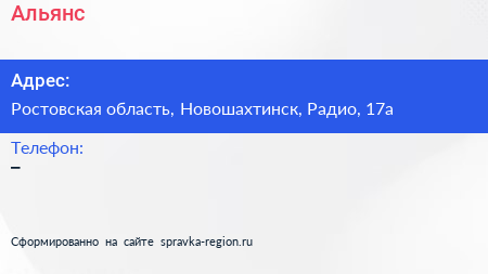 Альянс по адресу Ростовская область, Новошахтинск, Радио, 17а в дальнейшем Организация, размещена в следующих категориях: