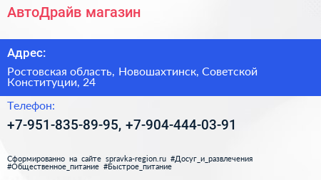 АвтоДрайв, магазин по адресу Ростовская область, Новошахтинск, Советской Конституции, 24 в дальнейшем Организация, размещена в следующих категориях: