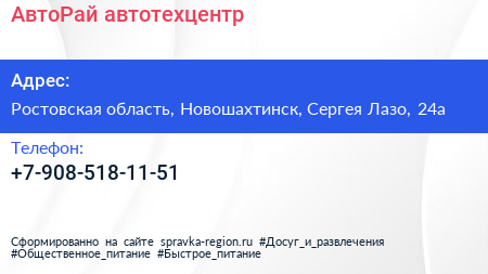 АвтоРай, автотехцентр по адресу Ростовская область, Новошахтинск, Сергея Лазо, 24а в дальнейшем Организация, размещена в следующих категориях: