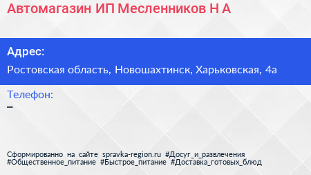 Автомагазин, ИП Месленников Н.А. по адресу Ростовская область, Новошахтинск, Харьковская, 4а в дальнейшем Организация, размещена в следующих категориях: