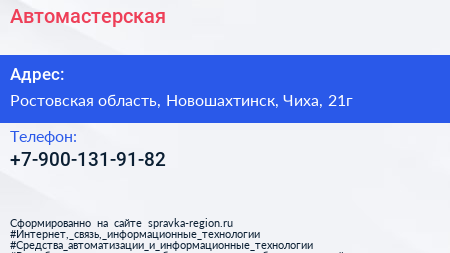 Автомастерская по адресу Ростовская область, Новошахтинск, Чиха, 21г в дальнейшем Организация, размещена в следующих категориях: