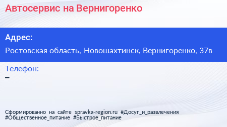 Автосервис на Вернигоренко по адресу Ростовская область, Новошахтинск, Вернигоренко, 37в в дальнейшем Организация, размещена в следующих категориях:
