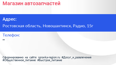 Магазин автозапчастей по адресу Ростовская область, Новошахтинск, Радио, 15г в дальнейшем Организация, размещена в следующих категориях: