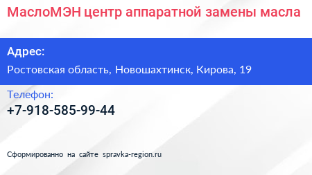 МаслоМЭН, центр аппаратной замены масла по адресу Ростовская область, Новошахтинск, Кирова, 19 в дальнейшем Организация, размещена в следующих категориях: