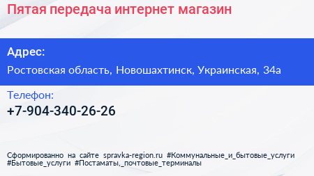 Пятая передача, интернет-магазин по адресу Ростовская область, Новошахтинск, Украинская, 34а в дальнейшем Организация, размещена в следующих категориях: