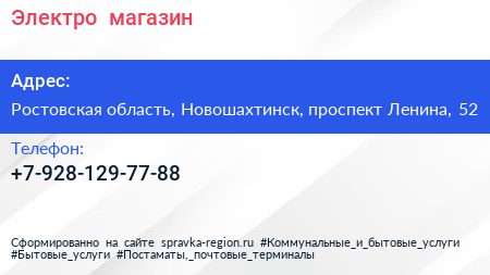 Электро+, магазин по адресу Ростовская область, Новошахтинск, проспект Ленина, 52 в дальнейшем Организация, размещена в следующих категориях: