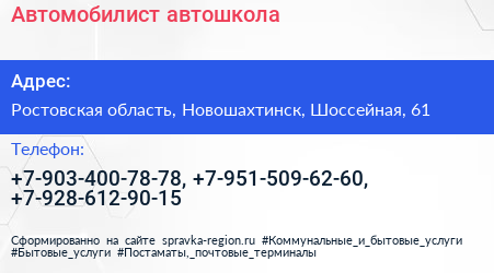 Автомобилист, автошкола по адресу Ростовская область, Новошахтинск, Шоссейная, 61 в дальнейшем Организация, размещена в следующих категориях: