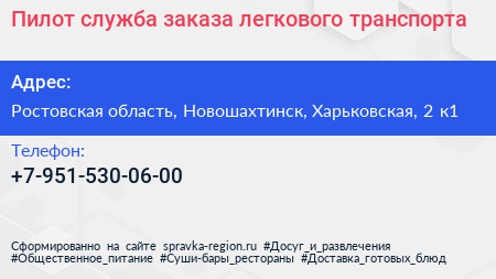 Пилот, служба заказа легкового транспорта по адресу Ростовская область, Новошахтинск, Харьковская, 2 к1 в дальнейшем Организация, размещена в следующих категориях: